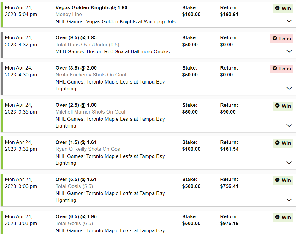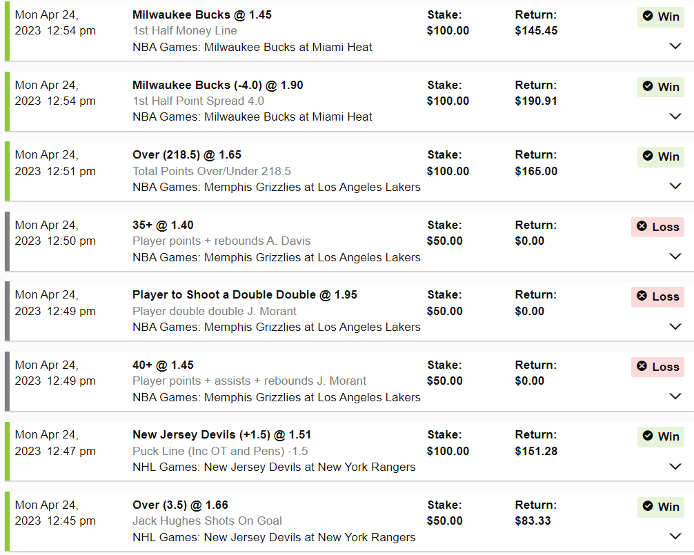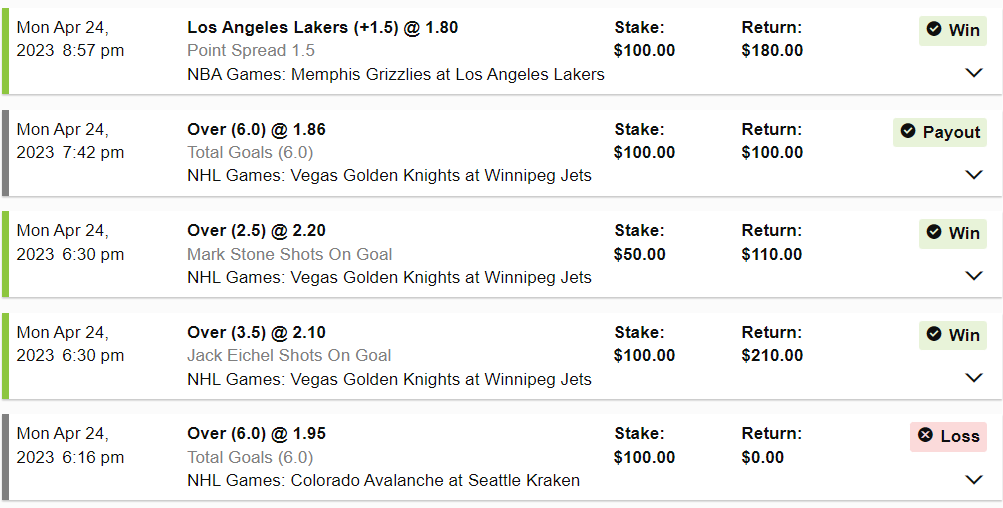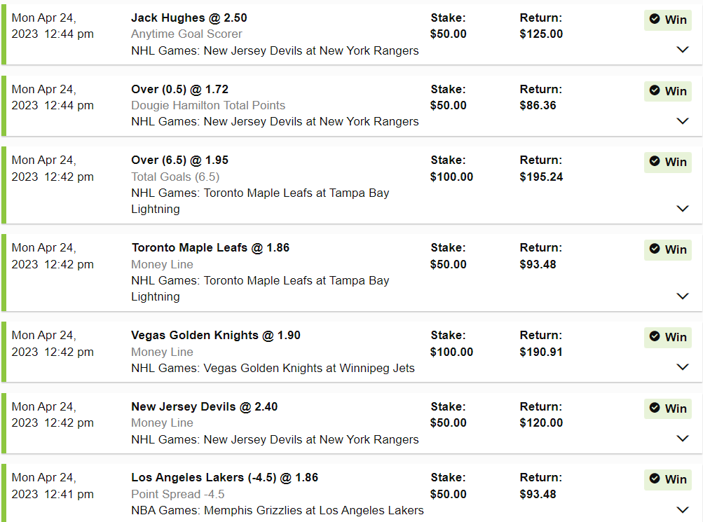 Tonight (Monday, April 24, 2023) was lucky because the Lakers came back to win and covered, and the Kraken also won their game. The Texas Rangers blew their 5-1 lead, which was not the outcome I wanted.
